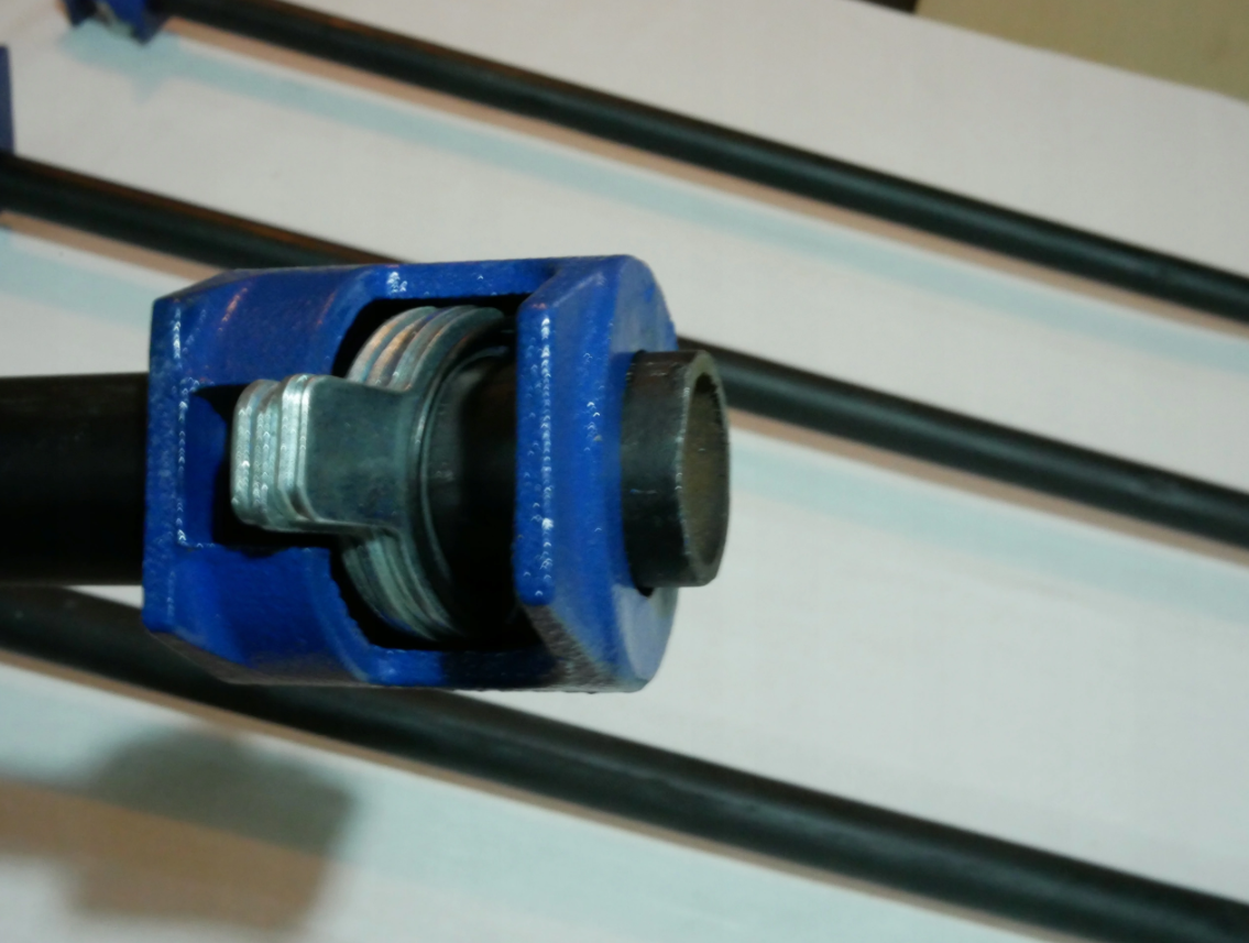 - Szczękę ze śrubą i nakrętką nakręcamy na gwint rury, tak aby wkręciła się do końca i zablokowała (to ważne, aby gwint nie został zerwany przy wysokiej sile ścisku).