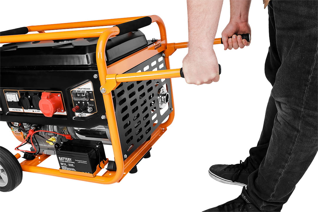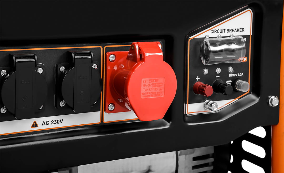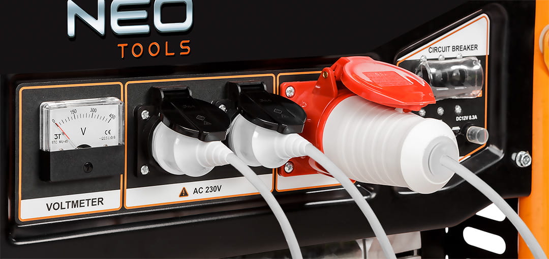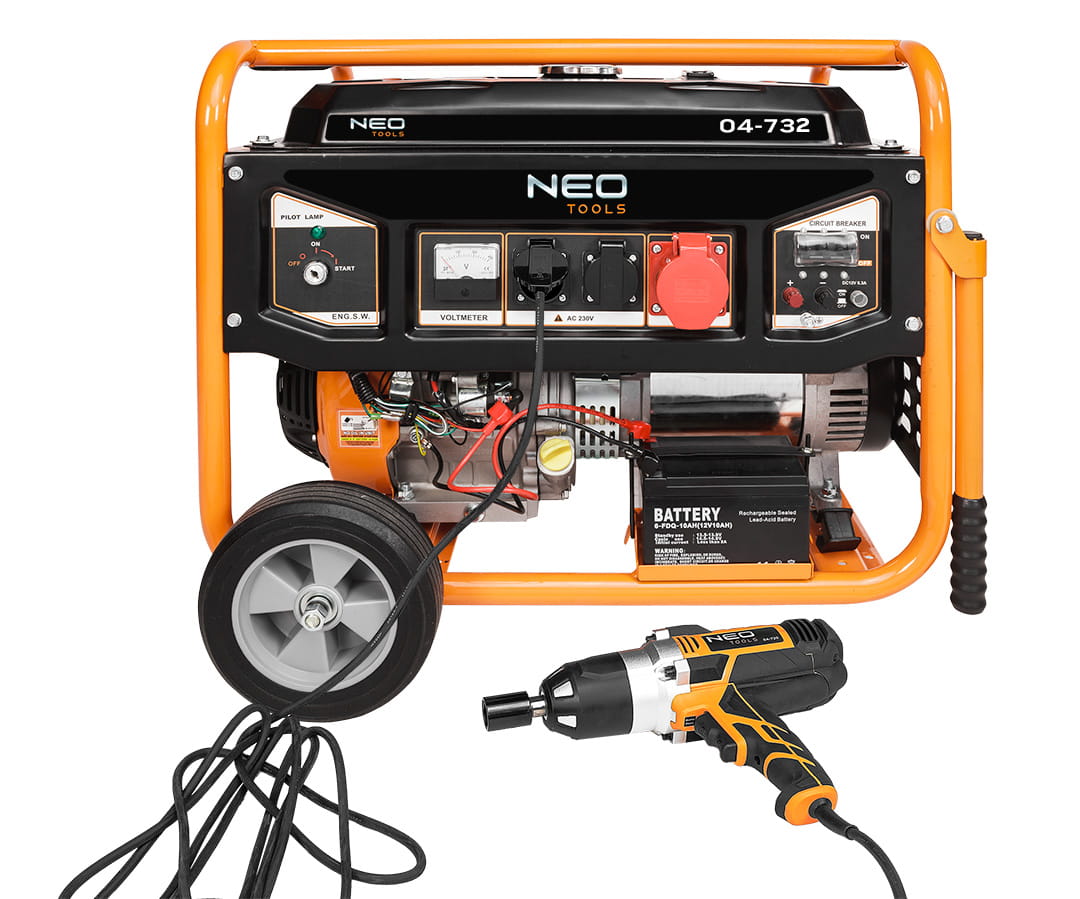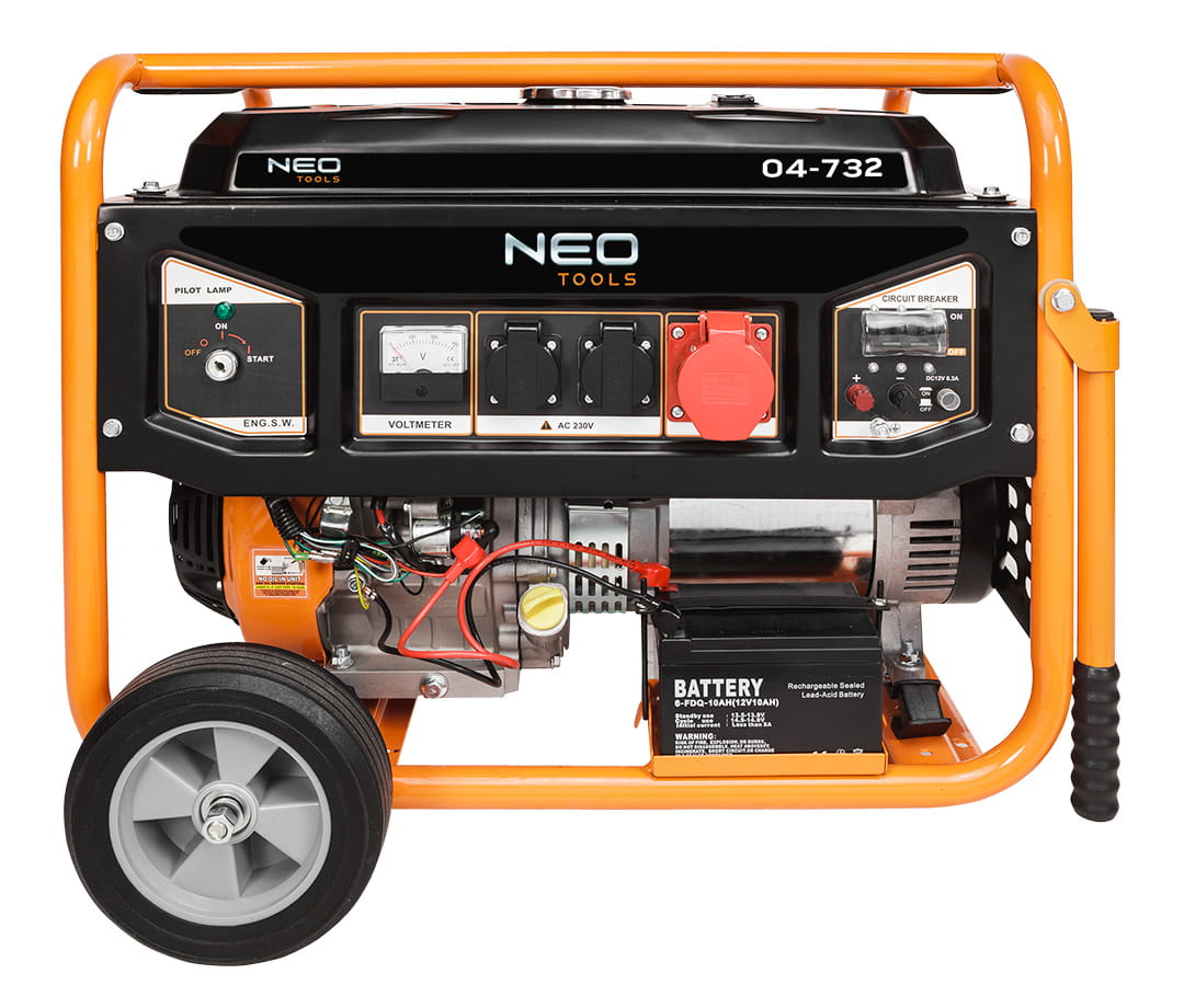 Agregat trojfazowy 7- 7,5kW Agregat prądotwórczy Wysokiej klasy generator prądotwórczy przeznaczone do zasilania różnego typu urządzeń elektrycznych w miejscach bez dostępu do sieci. Moc: 7000W/7500W, gniazdo 1x12V + 2x230V(10A) + 1x400V(10A), silnik benzynowy 11,84 kW/16 kM, zbiornik 25 l, min zużycie paliwa 313 g/kW.h średnie zużycie paliwa 5,1 l/h, wymiary (LxWxH) 695x530x560 mm, olej SAE10W-30, ilość oleju1,1l, paliwo 92,95,98, LwA = 97dB, waga 90 kg, 16HP, EURO V, AVR, IP 23M, typ świecy zapłonowej F6RTC, obroty 3000 min⁻¹, pojemność skokowa 439 CC Agregat trójfazowy 7 - 7,5 kW 04-732 marki NEO charakteryzuje się zbiornikiem o pojemności 25 litrów i średnim zużyciem paliwa około 5.1 l/h, a nominalnym – 313 g/kWh. Kompatybilny z olejem typu SAE15W-30 lub wyższym poziomem. Generuje 96 dB (A) głośności. Agregat marki NEO spełnia normę EURO 5 z serii europejskich standardów emisji spalin. Posiada klasę IP27 oraz osiąga prędkość 3000 obrotów na minutę. Urządzenie wyposażone jest w czterosuwowy, jednocylindrowy silnik schładzany powietrzem. Posiada praktyczne koła oraz uchwyt ułatwiający transportowanie. Uruchamiany jest na linkę oraz na kluczyk. Agregat marki NEO polecany jest w przypadku awarii zasilania oraz w miejscach bez dostępu do prądu.