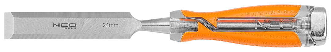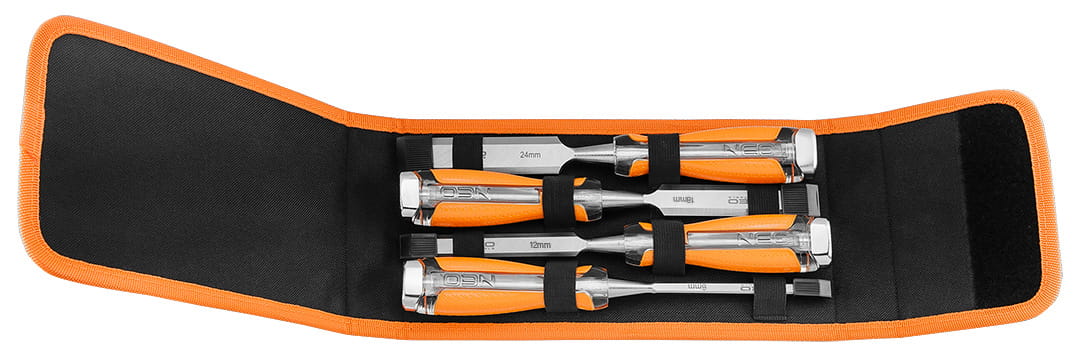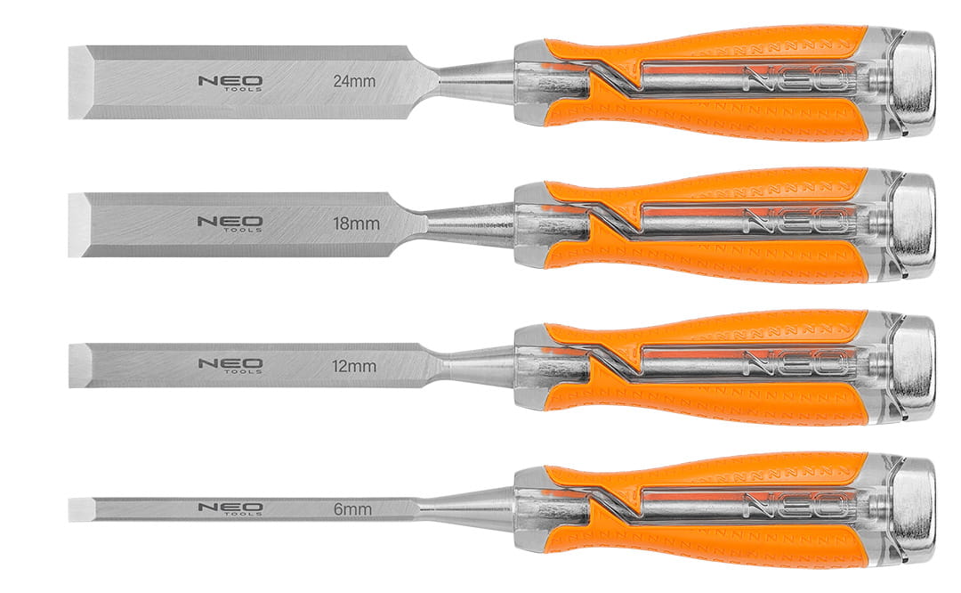 Dłuto do drewna, zestaw 4 szt., szerokości ostrzy: 6, 12, 18, 24 mm, ostrze ze stali CrV, dwumateriałowy uchwyt, wzmocnienie do pobijania