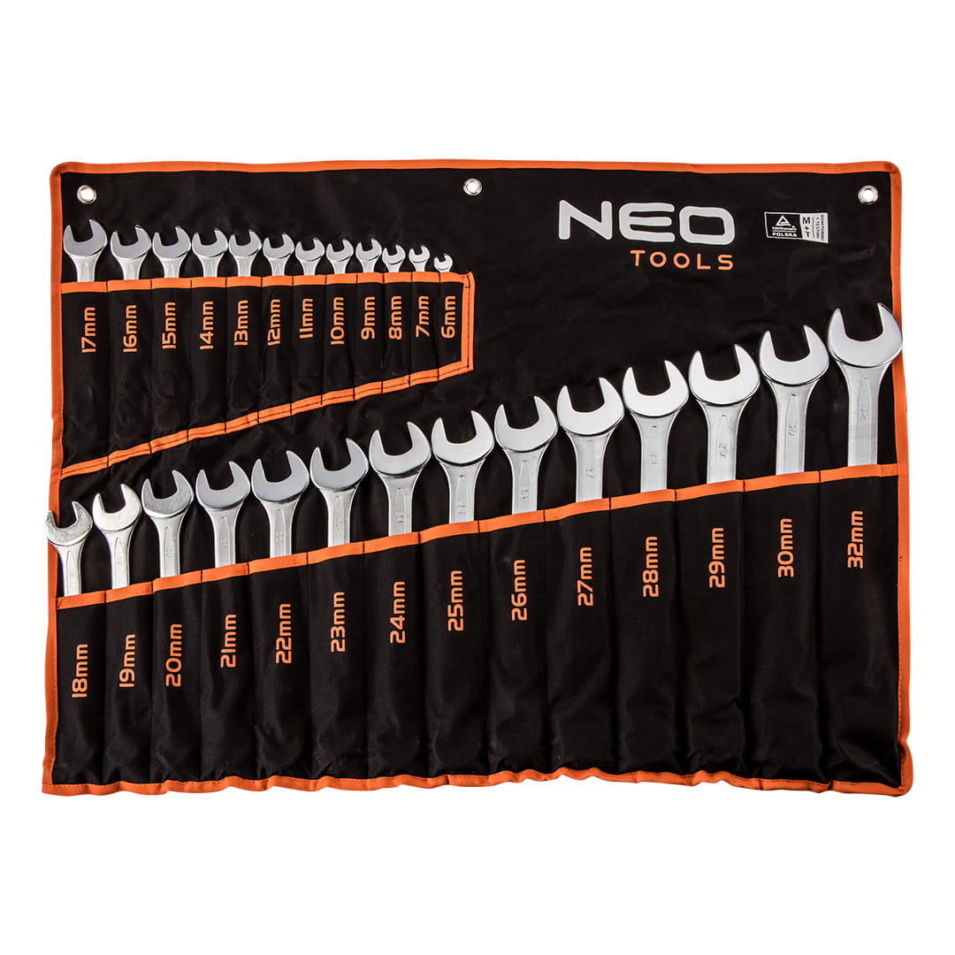 Klucze p艂asko-oczkowe 6-32 mm, zestaw 26 szt. Klucze p艂asko-oczkowe Klucze p艂asko-oczkowe 6-32 mm, zestaw 26 szt., rozmiary: 6, 7, 8, 9, 10, 11, 12, 13, 14, 15, 16, 17, 18, 19, 20, 21, 22, 23, 24, 25, 26, 27, 28, 29, 30, 32 mm, stal CrV, DIN3113, certyfikat T脺V M+T, 25 lat gwarancji Zestaw kluczy p艂asko-oczkowych NEO (nr ref. 09-754) zawiera 26 kluczy w popularnych rozmiarach (od 6 do 32 mm), wykonanych zgodnie z norm膮 DIN 3113. Wysokogatunkowa stal chromowo-wanadowa zapewnia d艂ugoletni膮 wytrzyma艂o艣膰 kluczy. Narz臋dzia dostarczane s膮 w praktycznym etui z nadrukowanymi wymiarami kluczy, co u艂atwia ich porz膮dkowanie. Jako艣膰 narz臋dzia potwierdzona certyfikatem T脺V i 25-letni膮 gwarancj膮 producenta. Marka NEO spe艂nia oczekiwania profesjonalist贸w.