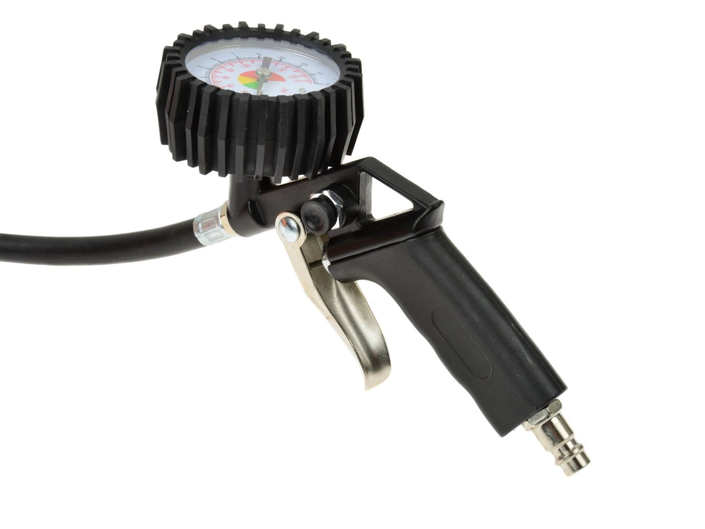 Profesjonalny pistolet pneumatyczny z manometrem - do pompowania kół samochodów osobowych i ciężarowych. Wyposażony w elastyczny wężyk o długości 37 cm i duży czytelny manometr w gumowej osłonie chroniącej przed wstrząsami i uderzeniami. Skala pomiarowa w dwóch jednostkach - Psi i Bar. Szybkozłącze 1/4" pozwala na szybkie podpięcie do kompresora.