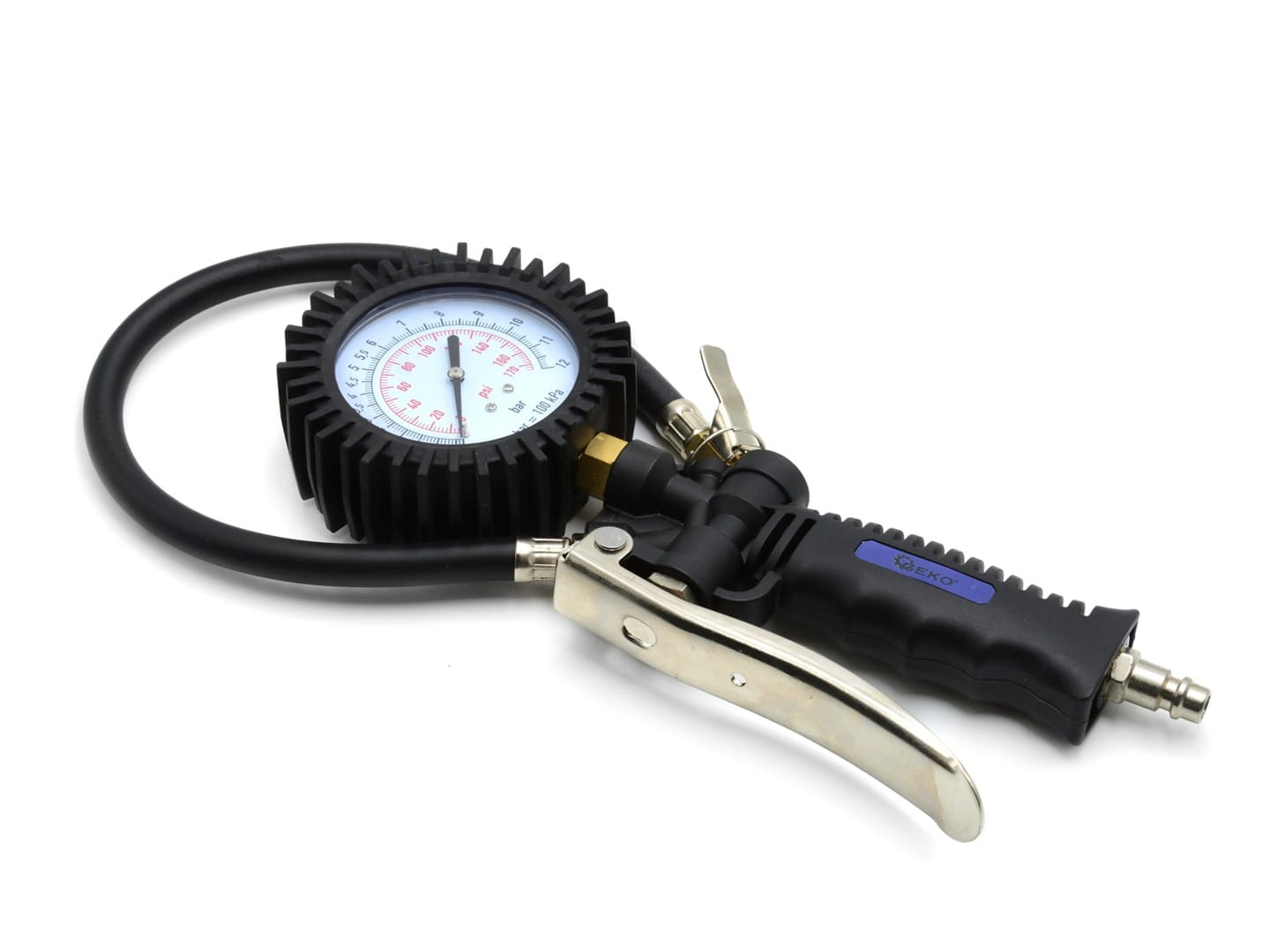 Profesjonalny pistolet pneumatyczny z manometrem - do pompowania kół samochodów osobowych i ciężarowych. Wyposażony w elastyczny wężyk o długości 45 cm i duży czytelny manometr w ;gumowej osłonie chroniącej przed wstrząsami i uderzeniami. Skala pomiarowa w dwóch jednostkach - Psi i Bar. Szybkozłącze 1/4" ;pozwala na szybkie podpięcie do kompresora.