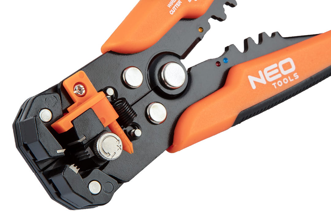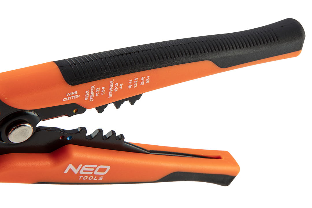 Ściągacz izolacji NEO jest przeznaczony do pracy z przewodami miedzianymi, aluminiowymi oraz innymi przewodnikami elektrycznymi, których średnica mieści się w zakresie od 0.5 do 6 mm² (dla ściągania izolacji) oraz 0.5 do 8 mm² (dla zaciskania końcówek konektorowych).