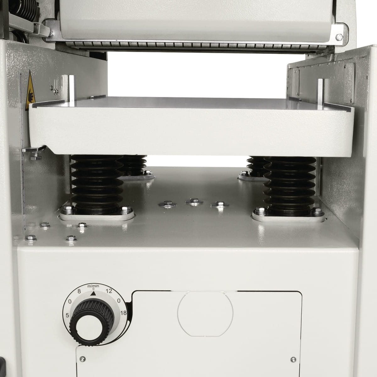 - Regulacja wysokości stołu grubościówki za pomocą koła ręcznego ze zintegrowanym wyświetlaczem wysokości strugania