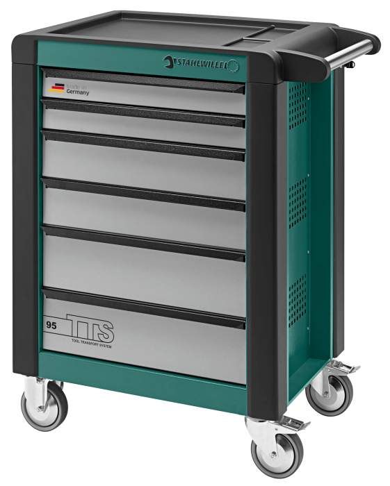 Wózek warsztatowy 95/6 Stahlwille charakteryzuje się uchwytem ze stali nierdzewnej, wszechstronną ochroną taranów z amortyzacją uderzeń, odporną tacką plastikową i gładko jezdnymi kołami odpornymi na olej i kwasy. Wózek posiada również 6 łatwo wyjmowanych szuflad z pełnym wysuwem i prowadnicą koszykową, a także trzystopniową koncepcję bezpieczeństwa.