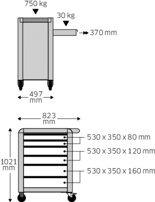 - Wymiary szuflady: 530 x 350 x 75 mm